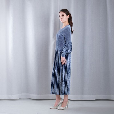 solid color round neck lantern sleeve A-line hem tea dressed casual wear evening gowns minimalism in blue