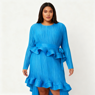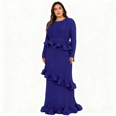solid color pleated overlay ruffle boat Neck long sleeve ruffled hemline loose maxi dresses evening gowns dance wear plus sizes in blue