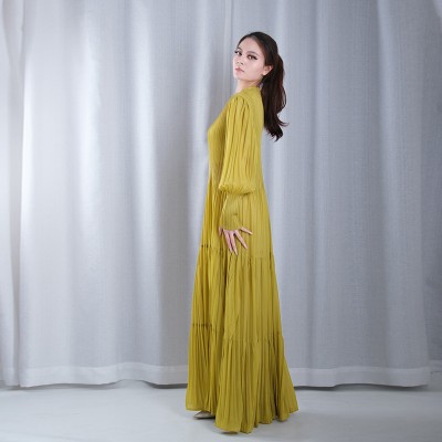 solid color pleated boat Neck lantern sleeve A-line hem loose maxi dresses evening gowns plus sizes in yellow