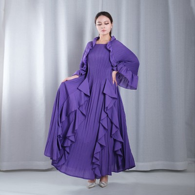 solid color pleated ruffle slit sleeve ruffled hemline loose maxi dresses evening gowns plus sizes in purple