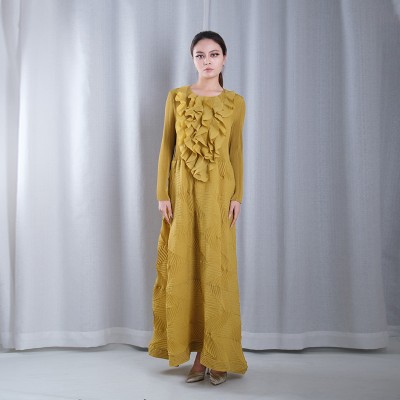 solid color pleated ruffle round neck long sleeve asymmetrical hemline loose full dresses evening gowns plus sizes in yellow