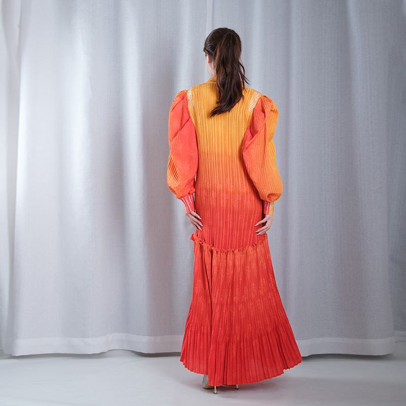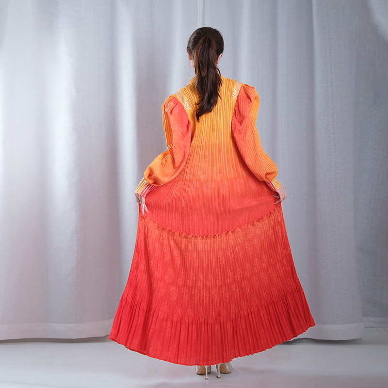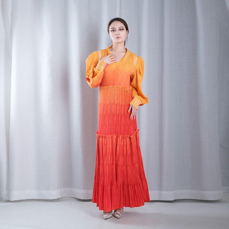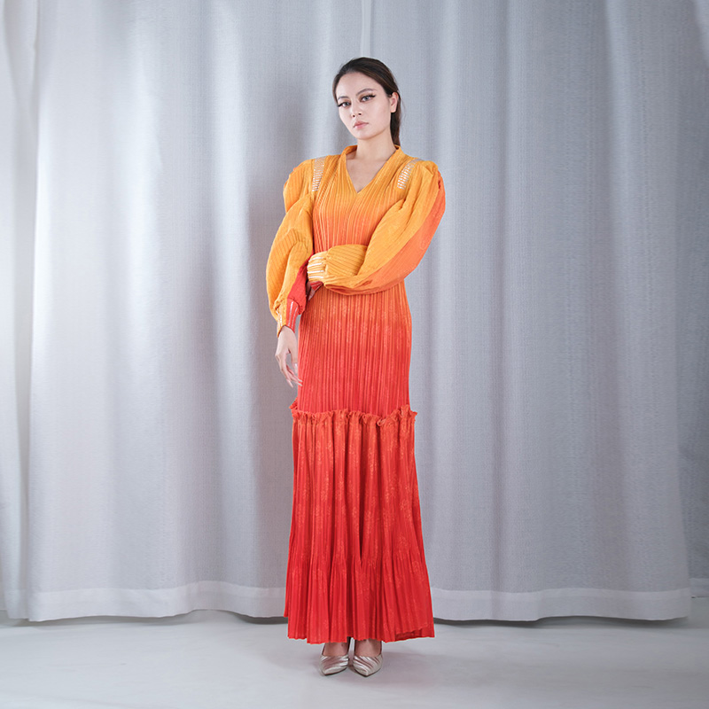 ombre pleated v neck lantern sleeve mermaid hem loose maxi dresses evening gowns in orange